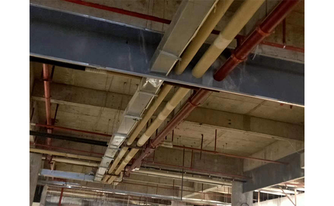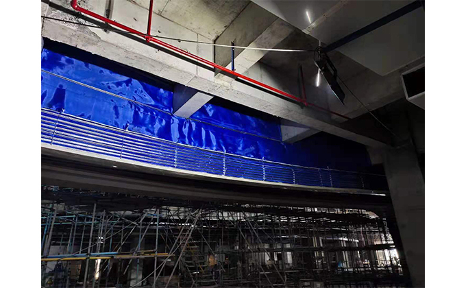 擋煙垂簾垂壁根據設計要求和現場實際情況采取如下施工順序:首先,搭設腳手架一放線一打眼--上脹栓一焊骨架。第二,吊件一安裝骨架。第三,吊件一調整水平。第四,垂直度--安裝防火簾片防火板一安裝防火玻璃一安裝不銹鋼玻璃蓋板。